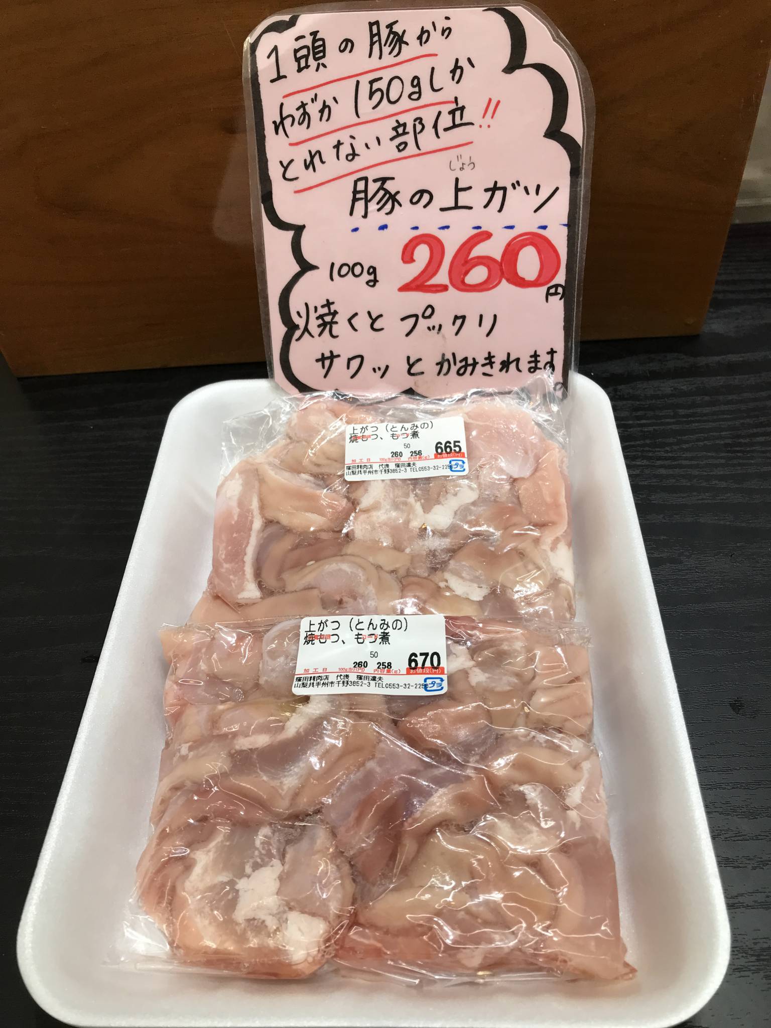 豚生上ガツとは、豚ガツの中の希少品です。豚一頭からわずか150g位しか採れない部位です。特徴はヌメリがあり・身が厚く・食感は柔らかく歯切れがよいので、お年寄りの方にも好評です。